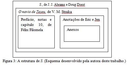 No aspecto estrutural, essa multiplicidade corresponde ao que Linda Hutcheon caracteriza como “that complex Chinese-box mise en abyme structure typical of so much metafiction” (HUTCHEON, 2014, p. 105, grifo no original). Wallace Martin corrobora essa afirmação, pois conceitua a metaficção como “embedded narration” (MARTIN, 1991, p. 135). Para demonstrar a estrutura múltipla e encadeada de S. e também para aproximá-la das considerações de Hutcheon e Martin, observem-se as figuras a seguir: