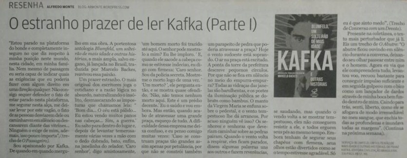 Sou apaixonado por Kafka. De quando em quando mergulho em sua obra. A portentosa antologia “BLUMFELD, UM SOLTEIRÃO DE MAIS IDADE E OUTRAS HISTÓRIAS”, a mais ampla, salvo engano, já lançada no Brasil, traduzida por Marcelo Backes, reavivou essa paixão.