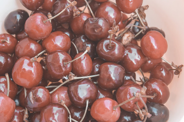 [Uma das minhas frutas favoritas. Por isso, se me querem ver feliz, basta colocarem-me uma taça de cerejas à frente. Que iguaria divinal! Com um travo doce, têm toque a dias quentes, que aconchegam a alma]