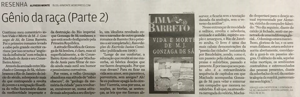 Continuo meu comentário sobre “VIDA E MORTE DE M. J. GONZAGA DE SÁ, de Lima Barreto. Foi o primeiro romance levado a cabo pelo grande escritor carioca (por isso se nota a “angústia da influência” com relação a Machado de Assis e seu Conselheiro Aires).