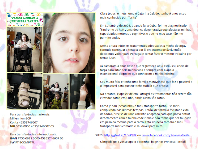 Ainda não conheço pessoalmente a Catarina, ou Princesa Tarita como é conhecida pelos amigos, mas conheço familiares e amigos que se dedicam a tentar melhorar a qualidade de vida desta menina.