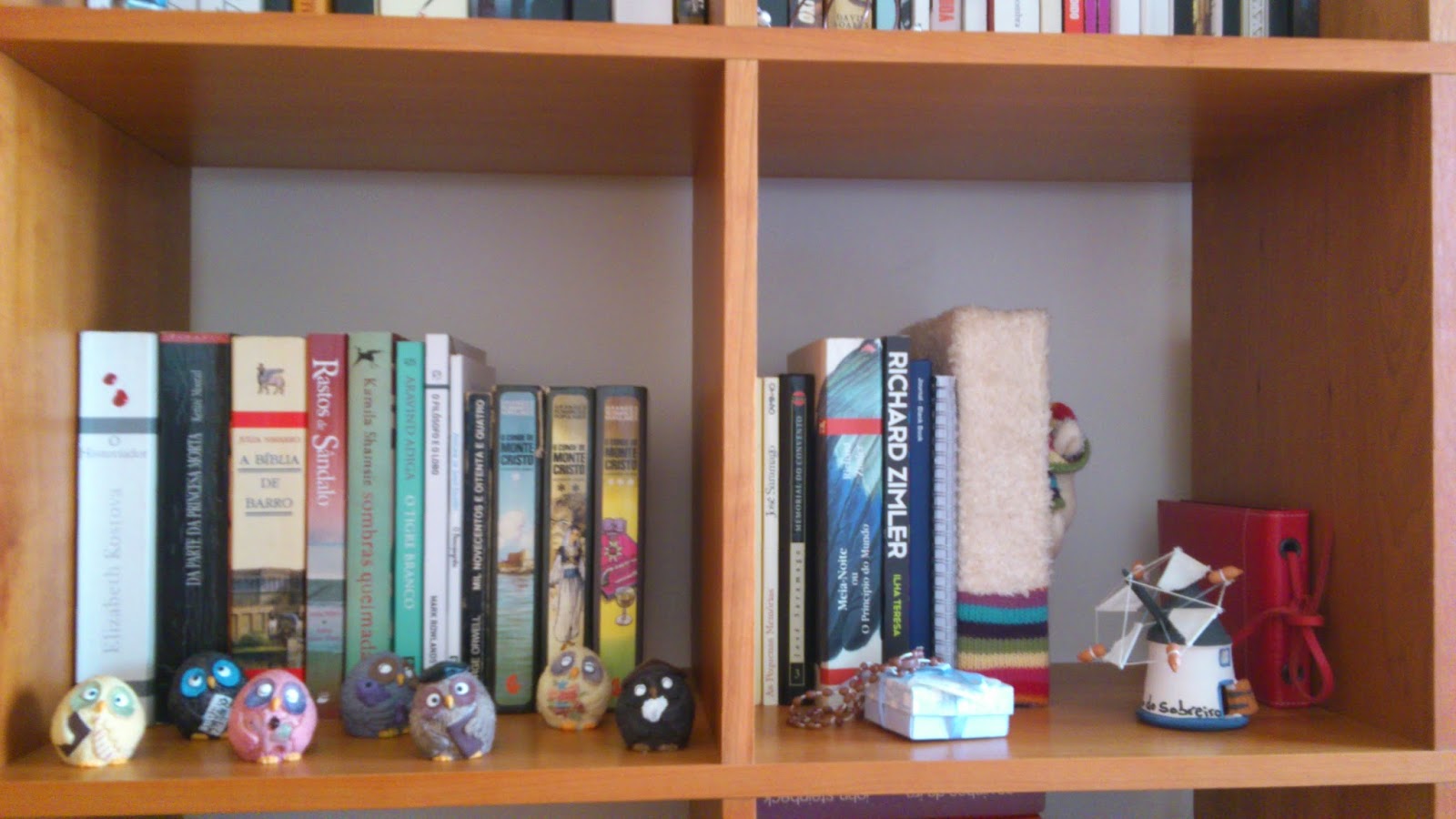 Os meus mochos (vindos diretamente do Japão) a fazer companhia aos três volumes do "O conde de Monte Cristo", à direita Saramago, Zimler e espaço para mais autores Portugueses.