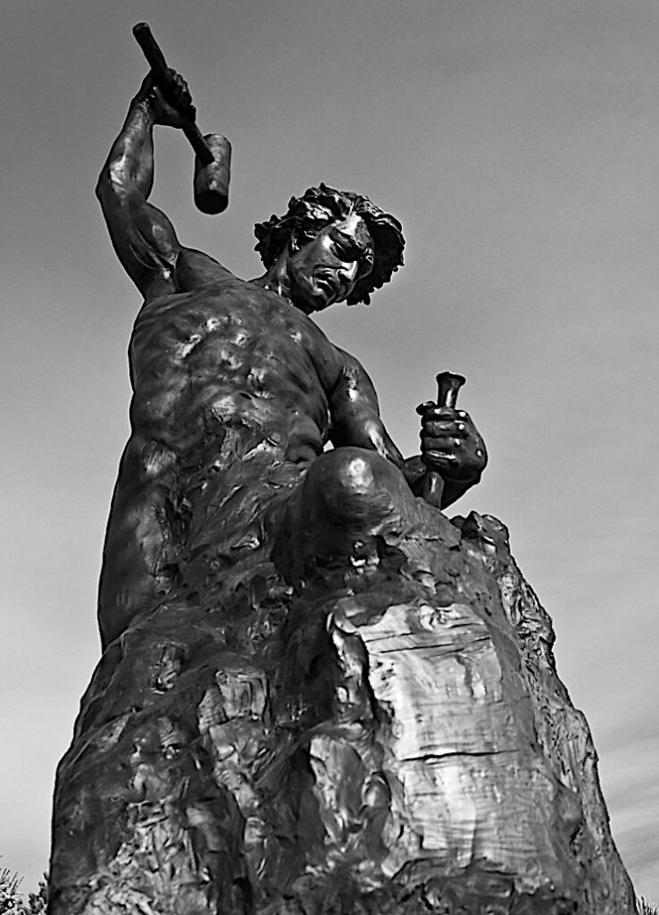 Ilustração: Self made man. Escultura de Bobbie Carlyle. Douglas County Library (Parker, Colorado, EUA). Foto (em preto e branco) de Joel A. Rogers (www.coastergallery.com).