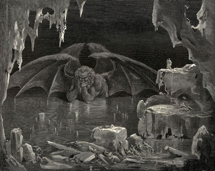 No trigésimo-quarto Canto do Inferno, Dante e Virgílio descem ao nono e último círculo na morada dos condenados: região reservada a quem cometeu o pecado da traição. Se fumaça e ardor caracterizam outras regiões da “Cidade Dolente”, o horrível porão do inferno é frio como a ingratidão humana. Sob o chão cristalino, em poses agônicas, há réprobos congelados “como palhas em frasco transparente”; e lá adiante, no centro da pavorosa tundra, está enterrado até a cintura o corpo colossal de Satanás. Batendo as asas de morcego, mas sem poder jamais levantar voo, o Diabo também agita sua monstruosa cabeça compósita, formada por três faces com as respectivas mandíbulas: todas em estado de perpétua mastigação. Virgílio então explica ao discípulo: na tríplice bocarra, Belzebu esmaga eternamente os três maiores traidores da História. A boca do meio mastiga Judas Iscariotes; a da direita, Caio Cássio; a da esquerda,Marco Bruto. O primeiro vendeu Cristo; os outros dois mataram Júlio César. São os supremos condenados, os maiores criminosos de todos os tempos; mas Dante deixa transparecer, em um verso delator, certa admiração pelo ocupante da terceira boca satânica: Bruto, como bom estoico, suporta o suplício “sem soltar nenhum gemido”. Estranha fortuna póstuma, a desse pecador honesto: por excesso de virtude, foi lançado no lugar mais profundo do inferno; pela mesma virtude, não se rebaixa a protestar. Ninguém dirá que não merece um lugar no panteão dos traidores – e, no entanto… no entanto… Essa infinita reticência, concentrada em uma linha de Dante, ressurgirá com sucinta grandeza na peça escrita por William Shakespeare alguns séculos depois: A Tragédia de Júlio César, obra de precisão atemporal sobre as ilusões da política, a força e a insuficiência das palavras e a cegueira humana no nevoeiro da História.