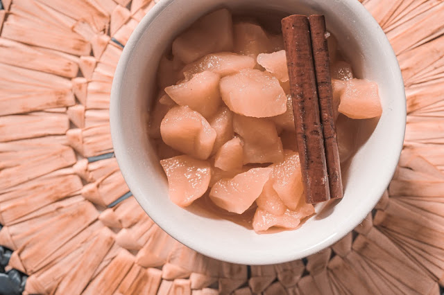 [Se existe receita que me transporta, automaticamente, para o outono é esta. O travo a canela em sintonia com o sabor da maçã conforta-me - e combina com tardes lentas, entre mantas, na companhia de um livro. Ou, então, com outro qualquer programa que nos aqueça a alma. Além disso, a sua confeção é simples e célere; e rende sempre bastante. Uma taça de maçã cozida e eu fico ainda mais feliz, não tem como enganar].
