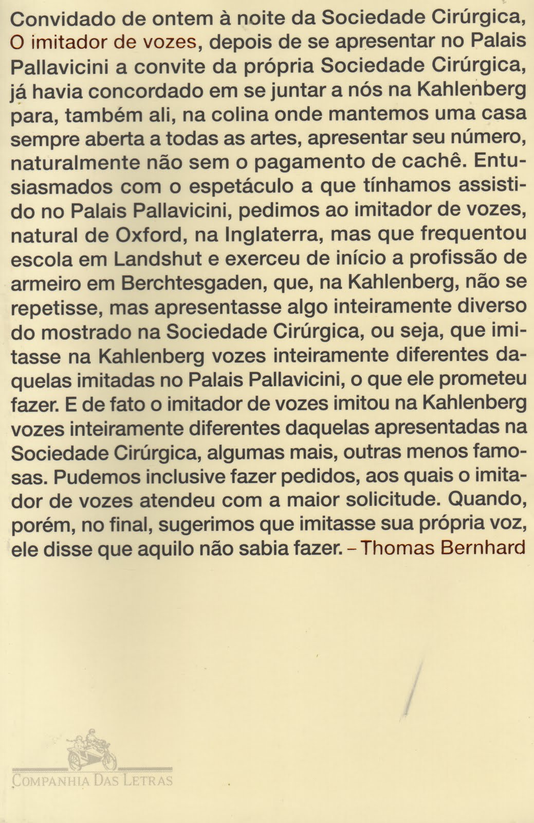 Posso dizer que a leitura de “O imitador de vozes”, de Thomas Bernhard, foi uma experiência singular. Não pretendia comprar o livro; já ouvira falar do autor e algumas pessoas até tinham dito que eu ia gostar de lê-lo ou que pensávamos parecido, mas não fiz nenhum movimento de aproximação (dizem isto a respeito de tantos autores e tantos livros que não consigo precisar exatamente o que os leitores pensam sobre o meu próprio estilo). Além disso, estou repleto de leituras obrigatórias que devem ser realizadas, e seria insensato comprar mais um livro se não poderia lê-lo tão cedo quanto gostaria. Por este motivo, chega a ser espantoso que tenha visto o livro. Logo na capa, um conto inteiro chamou a minha atenção. Ao chegar em casa, li a primeira história, a segunda e, quando vi, estava na décima, em seguida na trigésima, até chegar ao inapelável fim. Thomas Bernhard me laçou e me manietou, subjugando-me com habilidade tal que eclipsou todas as minhas outras obrigações e leituras.