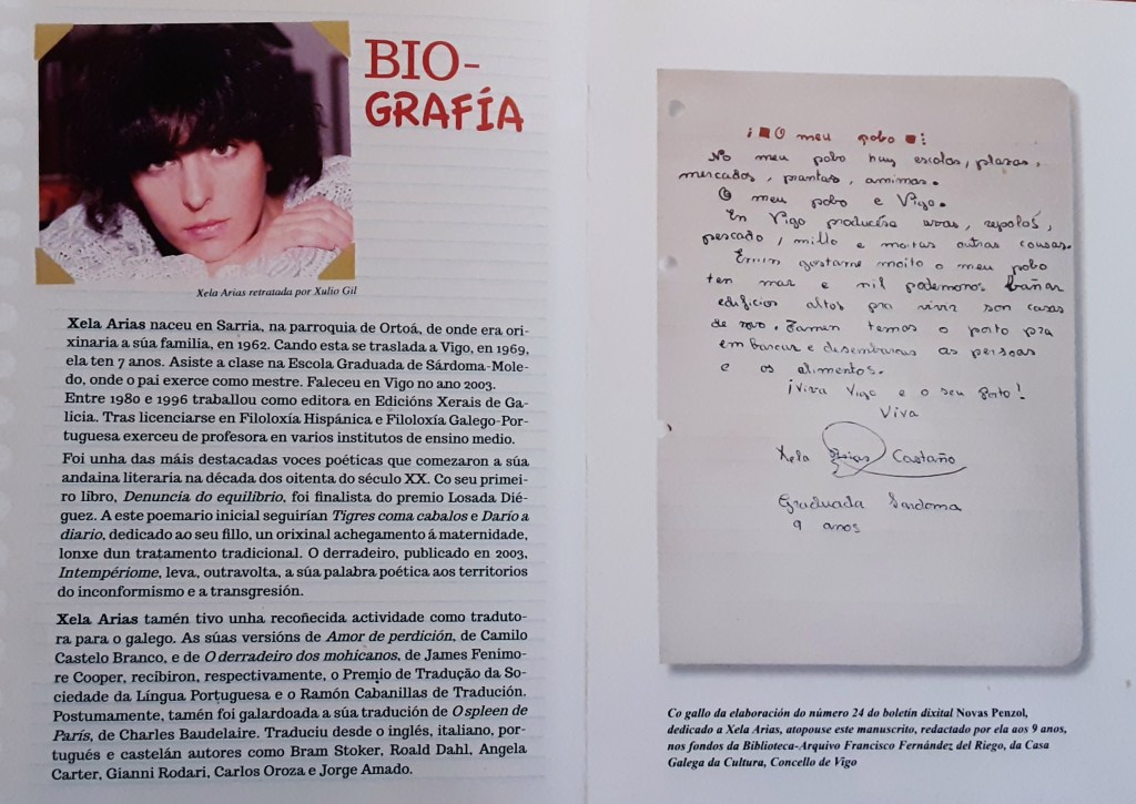 A publicación incorpora unha acaída síntese biográfica a carón da reprodución facsimilar dunha redacción escolar de Xela Arias depositada nos fondos da Biblioteca-Arquivo Francisco Fernández del Riego, custodiada como se sabe na Casa Galega da Cultura e da que se deu conta no boletín dixital Novas Penzol (nº 24), dedicado a Xela Arias e no que traballou, como fai adoito, o profesor Silvestre Gómez Xurxo.