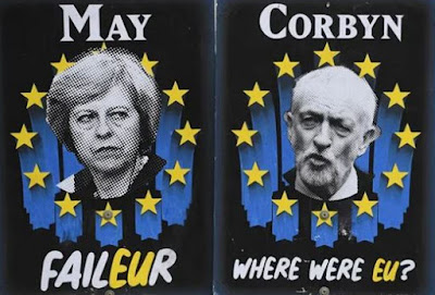 Imagem: cartaz a gozar com a primeira-ministra britânica e com o líder da Oposição. Clique.
