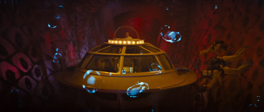 Em Viagem Fantástica, de 1966, a ciência já avançou exponencialmente. Apesar de ter como pano de fundo a Guerra Fria, quando o mundo ainda era dividido politicamente pela “Cortina de Ferro”, é o corpo humano que fornece o palco para uma zona de guerra: o filme descreve a possibilidade do encolhimento da matéria pelas mãos do Departamento Militar Americano, capaz de miniaturizar um exército inteiro e fazê-lo caber na tampa de uma garrafa se necessário. Ainda na primeira sequência acompanhamos a aterrissagem de um 707 e é aqui que vemos Fleischer exercitando à excelência seus talentos de plasticista e geômetra: a tela CinemaScope é repentinamente tomada por um verdadeiro balé construído pela montagem, que alterna o movimento das rodas do avião com a entrada em cena das pernas dos soldados. A enorme abstração condensa a gravidade do que assistimos em seguida: um senhor de aparência frágil desembarca, sofre um atentado terrorista logo em seguida, é ferido e acaba com uma lesão cerebral. Uma equipe médica é colocada dentro de um submarino que é encolhido e inserido no corpo deste homem para que uma intervenção cirúrgica seja feita sem riscos à sua vida, pois há uma questão de segurança nacional em jogo: ele é o único guardião do segredo que permite que o processo de miniaturização dure indefinidamente, algo até então impossível, pois tudo que é encolhido volta ao seu tamanho natural após sessenta minutos. A dinâmica de tensão entre os integrantes desta expedição médica é estabelecida pelo tempo escasso imposto para a execução da missão, o que acaba por revelar o potencial perverso e egoísta de uns e a vocação à coragem e sacrifício de outros. Enquanto a tripulação se une encontrando soluções para toda forma de dificuldade à frente, o médico encarregado da missão, Dr. Michaels (Donald Pleasence), revela-se um paranoico, fraco e sabotador, com atitudes de exclusiva autopreservação, acabando inevitavelmente por colocar a segurança de todos e a sua própria em risco. Se em 20.000 Léguas Submarinas era Ned quem tomava a atitude crucial na hora mais crítica, aqui temos o agente Grant (Stephen Boyd), que apesar de não entender nada de medicina (e por isso reluta a princípio em participar da jornada) é a pessoa que no momento decisivo assegura o melhor desenlace para os objetivos da missão.