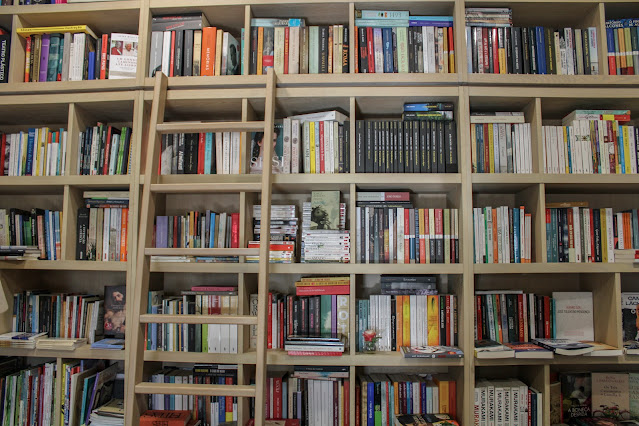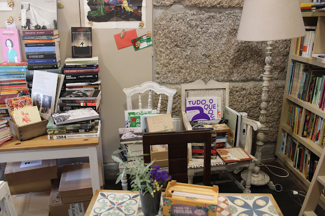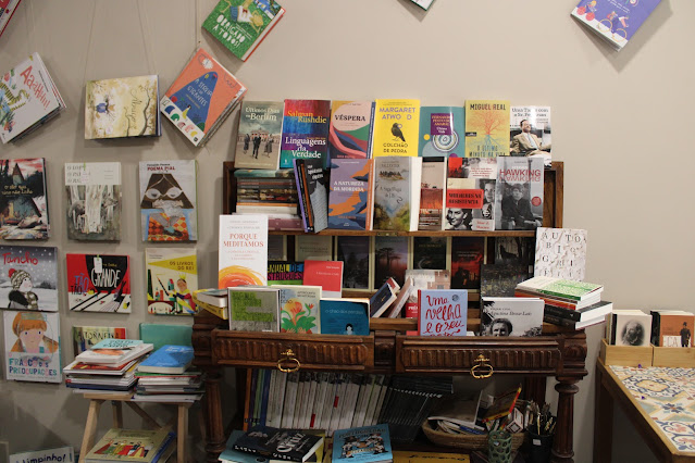 Aproveitando elementos que poderíamos encontrar em casa, como armários, gavetas e prateleiras, até a decoração nos leva numa viagem literária. E não posso deixar de referir a simpatia da Ana e da Sílvia, duas irmãs que tiveram a ideia de abrir um espaço «para quem gosta de livros e de boa conversa», que tão bem me receberam. Deixaram-me à vontade a descobrir os exemplares disponíveis - uma seleção que inclui vários géneros e autores -, a fotografar e, no fim, ainda conversamos um pouco sobre um livro que procurava. Foi uma interação breve, mas senti que se interessam genuinamente pelas pessoas que recebem nesta casa.
