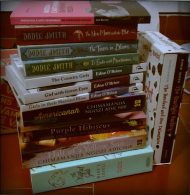 Das três autoras cujos livros aparecem na foto, li apenas uma, Dodie Smith, de quem comprei também aquela que é, de forma indirecta, a sua obra mais conhecida. Sobre Chimamanda estou curiosa há alguns anos, e sobre a trilogia de Edna O'Brien idem. Também um livro biográfico sobre as irmãs Mitford, cujos livros quero muito ler um dia, mas cuja vida familiar me apela.