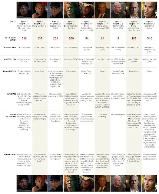 The Expendables, filme dirigido e estrelado por Sylvester Stallone, já está nos cinemas a um bom tempinho. Mas você sabe as principais características de cada um dos atores? Pensando nisso, a Empire Online elaborou a tabela comparativa abaixo.