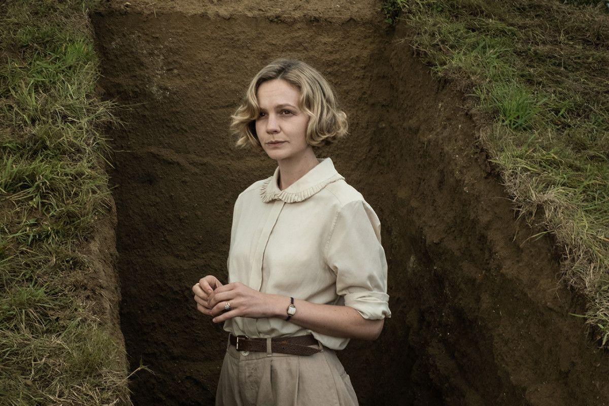 No final, a guerra vai começar. Milhões nela morrerão. Já era assim muito antes de Redualdo, como mostram as estelas no British Museum com as campanhas militares de Assurbanipal, que viveu 1200 anos antes do rei da Ânglia Oriental. As pessoas desaparecem, mas o que tornou sua vida mais bela e suportável fica. Em uma conversa com Brown, no carro, Edith perde o controle emocional; sabe que está doente e vai morrer. Os túmulos encontrados em sua propriedade, onde nem o corpo nem o barco do chefe guerreiro sepultado perduraram, são uma parábola para a sua própria mortalidade. Ela diz: “We die and we decay. We don´t live on”. Basil Brown discorda. Faz isso da maneira mais caricaturalmente inglesa, dizendo: “Oh, I´m not sure I agree”. Ele acredita que, desde que o homem primeiro deixou a marca de sua mão nas cavernas pré-históricas, somos todos, nas sucessivas gerações, parte de algo contínuo e que, por isso, não morremos de verdade. Pouco depois, a história acabando, acontece a cena mais emocionante. O filho de Edith, Robert, ainda criança — interpretado inteligentemente por Archie Barnes — compartilha com ela a sua ideia poética do que significa partir, enquanto os dois estão deitados na grama perto da escavação, de noite, olhando as estrelas. Robert provavelmente não entende que está explicando à sua mãe a morte dela, mas acalma seus temores.