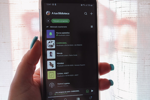 Ask.tm [Pedro Teixeira da Mota], Terapia de Casal [Rita da Nova & Guilherme Fonseca], Falsos Lentos [Diogo Batáguas, Carlos Coutinho Vilhena & Manuel Cardoso], Livra-te [Rita da Nova & Joana da Silva] e Crise de Identidade [Sofia Costa Lima] são exemplos dos que acompanho com regularidade, mantendo-os atualizados. No entanto, há outros que permanecem na lista e que vou escutando nos momentos mais oportunos. Depois, como sou bastante curiosa, acabo por querer descobrir podcasts novos, que me acrescentem e entretenham.