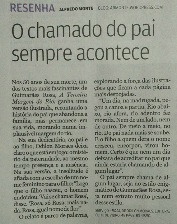 Na sua dedicatória, ao pai e ao filho, Odilon Moraes deixa claro o que está em jogo: o mistério da paternidade, ao mesmo tempo presença e a ausência. Na sua versão a insolitude é afiada com a escolha de um nome feminino para o filho: “Logo que o filho nasceu, o homem endoidou. ‘Vai se chamar Rosa’, disse. ‘Rosa, só Rosa, mais nada. Rosa, igual nome de flor’”.