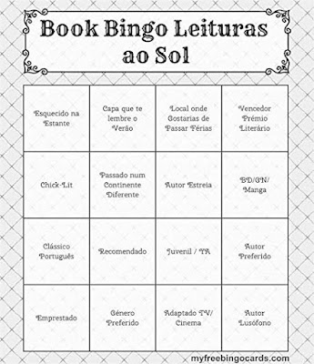 O Book Bingo - Leituras ao Sol decorre de 21 de Junho a 22 de Setembro, começando, portanto, na quarta. Vou combinar as minhas escolhas para este desafio com as da Maratona Literária (há limites para o que uma pessoa consegue ler em três meses!), sendo que neste vou mesmo participar.