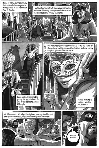 Sendo perseguido de tal forma pelo “amaldiçoado destino”, Wilson começa uma interminável excursão pelas principais cidades da Europa (Paris, Roma, Viena, Berlim, Moscou) e o “misterioso poder” sempre lhe atabalhoa os passos e frustra-lhe os (maus) intentos. O “duplo” aparece sempre, vestido identicamente, porém já não mostra o rosto. E o círculo vicioso vai se mantendo até o carnaval em Roma em 18.. (os autores oitocentistas adoram esse expediente): “Até então, eu sempre me submetera, de uma maneira covarde, à sua imperiosa vontade”. Wilson planeja seduzir a jovem esposa do velho duque que oferece o baile carnavalesco (carnaval=máscaras=personas=identidades desdobráveis). Antes, todavia, de poder abordá-la, ele próprio é abordado com um leve toque no ombro e um “inesquecível murmúrio ao ouvido, murmúrio que eu tantas vezes já amaldiçoara!” Enfurecido, ele provoca o seu duplo, abre caminho pelo salão de baile até uma pequena antecâmara, sabendo que o outro o seguirá. E assim os dois começam uma luta de espadas, após uma pequena hesitação por parte do “outro” William Wilson, o qual “com um ligeiro suspiro, pôs-se em guarda, silenciosamente demonstrando uma calma extraordinária”.