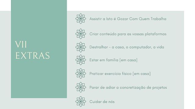 É certo que o COVID-19 tem impedido um plano direto. Pelos sintomas e, sobretudo, pelo período de manifestação. E é esta imprevisibilidade que nos amedronta. Portanto, antecipar, como mencionou Bruno Nogueira, parece-me o mantra mais acertado. Infelizmente, a contenção não abrange toda a sociedade, porque há inúmeros serviços em funcionamento presencial. Mas, caso exista a possibilidade de reduzirem o contacto e trabalhar a partir de casa, as rotinas só carecem de um reajustamento. Até porque não é tempo de pensarmos apenas no nosso umbigo. É tempo de cuidarmos. Juntos. De agirmos por um bem maior. E de sermos capazes de compreender que é preferível fazermos um esforço redobrado agora, do que termos que gerir consequências irreversíveis num futuro próximo.