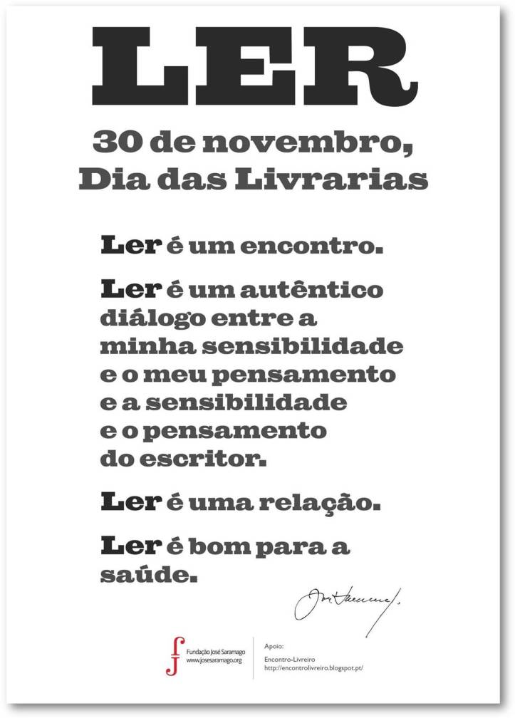 Deixamos, em seguida, o texto da Associação de Livrarias de Espanha, um manifesto que acolhemos como documento orientador para este que queremos que seja o primeiro de muitos Dia das Livrarias, e um cartaz da Fundação José Saramago com um texto do Escritor, que sintetiza os princípios que nos guiam, e que disponibilizamos para que os que assim o entenderem o coloquem nos seus espaços, físicos e virtuais.