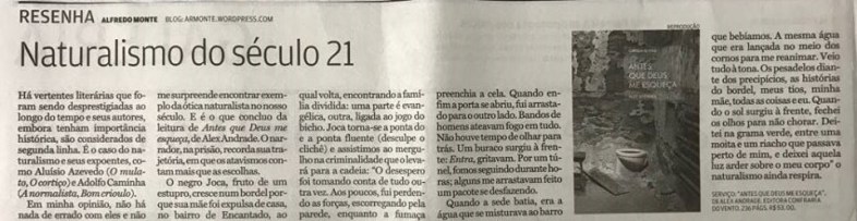 Em minha opinião, não há nada de errado com eles e não me surpreende encontrar exemplo da ótica naturalista no nosso século. E é o que concluo da leitura de “ANTES QUE DEUS ME ESQUEÇA”, de Alex Andrade. O narrador, na prisão recorda sua trajetória em que os atavismos contam mais que as escolhas.
