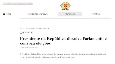 FEITO Fonte: Da Literatura - Eduardo Pitta | Publicado em: 2021-12-01 00:00 Política, Parlamento, Eleições domingo, 5 de dezembro de 2021 FEITO Hoje mesmo: Parlamento dissolvido, eleições convocadas. Clique na imagem. à(s) 11:00 Texto originalmente publicado em Da Literatura - Eduardo Pitta Leia também O ESTADO DA NAÇÃO via Da Literatura - Eduardo Pitta NONSENSE via Da Literatura - Eduardo Pitta EM QUE FICAMOS? via Da Literatura - Eduardo Pitta NÚMEROS FINAIS via Da Literatura - Eduardo Pitta DESCONFINAR via Da Literatura - Eduardo Pitta