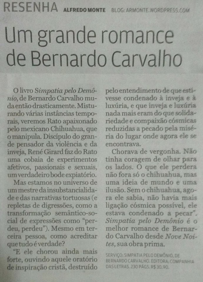 “SIMPATIA PELO DEMÔNIO” é o melhor romance de Bernardo Carvalho desde “Nove Noites”, sua obra prima.
