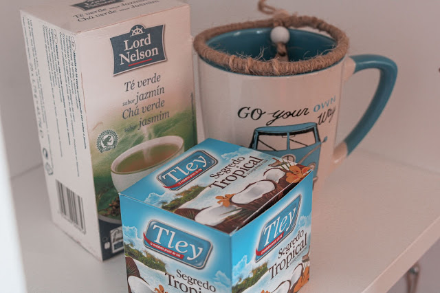 Chás: Tudo fica melhor na companhia de uma chávena de chá, por isso, aproveito todas as ocasiões para abastecer a dispensa com opções que têm o meu coração. Quase sempre, quando faço compras no Auchan, trago jasmim a granel, mas a minha mãe encontrou estas saquetas da Lord Nelson [no Lidl] e, desde então, têm sido uma aposta recorrente, porque o sabor é muito fidedigno. Além disso, voltei a perder-me pelo Segredo Tropical, que combina, de forma equilibrada, coco e baunilha.