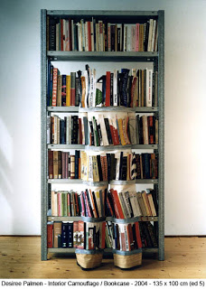 No saite da artista (http://www.desireepalmen.nl/) há várias séries de fotos desse tipo. Uma pessoa está parada diante de uma estante de livros; percebemos uma distorção visual que corre verticalmente ao longo da estante (as lombadas estão tortas, parecendo amassadas) até que, no chão, percebemos os pés do indivíduo que está ali. Sua roupa foi coberta com a pintura ou a reprodução fotográfica dos próprios livros que ele está escondendo.