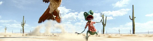 De qualquer forma, quando o filme termina você até perdoa o roteirista John Logan. Tudo bem que ele teve alguma dificuldade em transformar a história criada por ele e pelo diretor Gore Verbinski em um longa-metragem, causando uma leve enrolação lá pelo meio do filme que quebra um pouco o ritmo. Afinal, essa é a animação com as melhores texturas já vistas! Não falo apenas do camaleão (ele é o que menos impressiona), mas dos outros animais e, principalmente, do ser humano. Até então, todas as pessoas que apareciam em filmes de animação tinham peles lisas e caricatas demais. Em Toy Story, por exemplo, elas quase conseguem quebrar com a magia. Já em Rango, quando o Espírito do Oeste (Timothy Olyphant) surge na tela, a magia só aumenta – e quem gosta de cinema ainda leva uma boa surpresa de brinde!