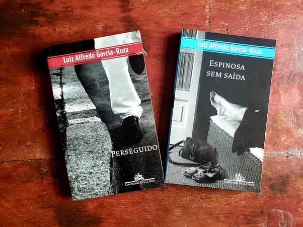 Em Perseguido, o detetive de Garcia-Roza sai mais cedo da delegacia para caçar mais livros em um sebo. Lemos que em sua casa não há estantes ou prateleiras, mas sim “uma singular obra de engenharia doméstica”. Espinosa amontoa os volumes contra a parede, em sucessivas camadas, alternadas, de livros deitados e de livros na vertical: “uma biblioteca em estado puro, sem nenhum elemento que não fosse livro”.