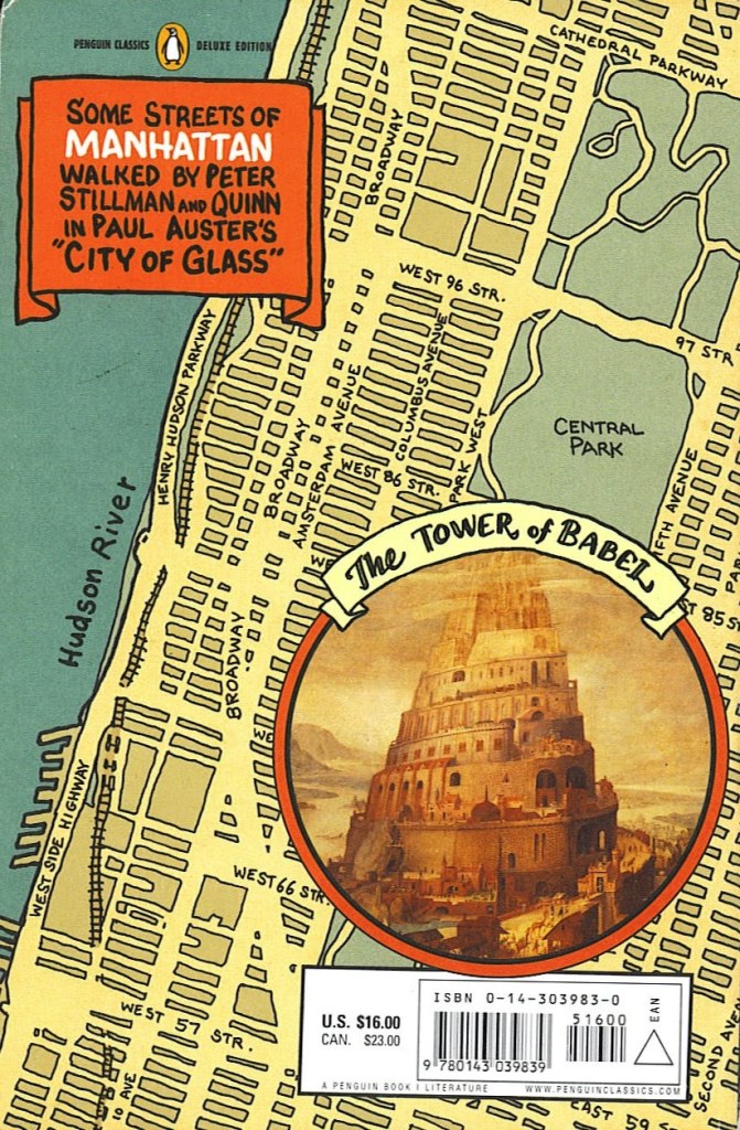 A esse preâmbulo se pode acrescentar frases tiradas do primeiro texto, Cidade de vidro (City of glass), verdadeiras chaves para entender o universo austeriano: “nada era real a não ser o acaso”; “Nova York era o lugar nenhum que ele havia construído em torno de si mesmo”; “o que interessava nas histórias que escrevia não era a sua relação com o mundo, mas a sua relação com outras histórias”.