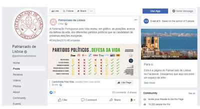 A pretexto da “defesa da vida”, eufemismo de combate ao direito das mulheres interromperem voluntariamente a gravidez, o Patriarcado de Lisboa publicou no seu mural um apelo directo ao voto no CDS, na coligação BASTA e no NÓS CIDADÃOS.