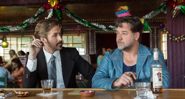 O importante nesse caso é, então, a química entre os protagonistas e como essa dinâmica é aproveitada em cena. Infelizmente, não acho que ambas essas coisas estejam exatamente 'no ponto', pois, ainda que o humor seja interessante, falta um elemento capaz de fazer com que esses contrastes se sobressaiam. As atuações não são ruins e, individualmente, até funcionam, porém, não acho que se complementam de modo orgânico. É muito mais divertido ver Ryan Gosling interagindo com Angourie Rice do que com Russell Crowe, o que evidencia certo potencial desperdiçado no filme.