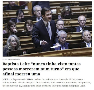 Facto: «O Hospital de Cascais esclarece que no passado sábado, dia 16 de Janeiro, foram registados seis óbitos nesta unidade, três dos quais na urgência dedicada a doentes suspeitos ou positivos Covid-19, tendo um desses óbitos ocorrido no turno entre as 08h00 e as 20h00.»