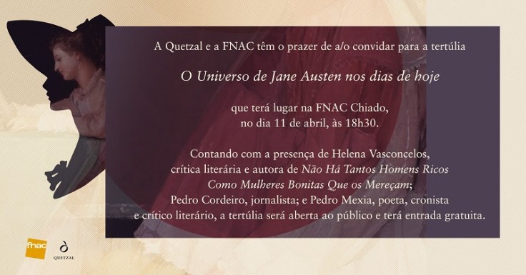 A Quetzal e a FNAC têm o prazer de a/o convidar para a tertúlia «O Universo de Jane Austen nos dias de hoje», que terá lugar na FNAC Chiado, na terça-feira, dia 11 de abril, às 18h30.