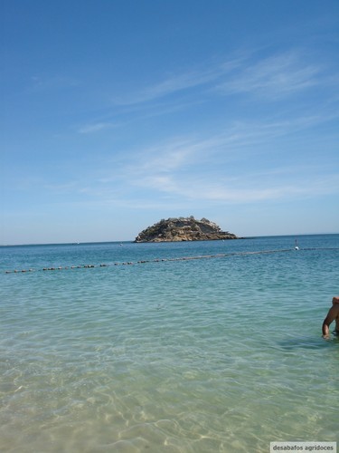 Não gosto muito de fazer praia, mas quando faço vou sempre para o Portinho da Arrábida. É uma praia linda, mesmo no fundo da serra. Não tem muita gente... fica a uma hora de caminho (quem vem de Lisboa de carro). Mas vale apena, porque a vista é de cortar a respiração. quando se sobe a serra a primeira coisa que se ve é o mar, azul profundo em contraste com o céu, como se os dois se fundissem num abraço eterno. Depois começa-se a avistar o areal. uma faixa pequenina encrava entre o mar e a serra escarpada...de um lado o mar, amante ternurento, e do outro serra, imponente e séria, vigilante como uma mãe. O mar não ondeia aqui, só é preciso ter cuidado com as correntes. Quando o sol escalda, pode-se descansar junto ao arvoredo.