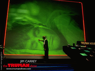 No filme O Show de Truman, de Peter Weir, Jim Carey é um rapaz que pensa viver uma vida normal, mas é o personagem de um gigantesco e caríssimo “reality show”. Desde bebê, Truman Burbank vem sendo criado por uma “família” de atores, num cenário montado pela emissora de TV que fatura com seu programa 24 horas no ar. Primeiro, numa casa, depois com uma creche, escola, rua, bairro, finalmente uma cidade cenográfica inteira, mantida no interior de uma cúpula, povoada em tempo integral por atores e figurantes que fingem viver uma vida normal.