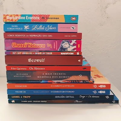 Mês que deu origem a muito recheio novo na estante (e necessidade de reorganização de estantes também, consequentemente). Do programa Bookstars da Book Depository, recebi Ballet Shoes, de Noel Streatfeild, um clássico infantil que é lacuna nas editoras portuguesas; da autora Ana Gil Campos, recebi gentilmente uma cópia do seu novo livro, edição de autor, Lobos Sedentos da Respiração dos Dias; da Assírio & Alvim, recebi a nova, belíssima edição de Beowulf, livro que quero ler há anos mas que tinha receio de encarar no original (conheço uma pessoa que desistiu do curso de Línguas e Literaturas à custa desta obra); da Quetzal, veio A Mais Secreta Memória dos Homens, de Mohamed Mbougar Sarr, prémio Goncourt; do Festival Folio, deram entrada cá em casa Mr Loverman, de Bernardine Evaristo, e Abismos, de Pilar Quintana; do Amadora BD, vieram Combate Quotidiano (vols. 1 e 2), Mausart, o segundo volume de Armazém Central (todos estes da Arte de Autor, Combate Quotidiano em co-edição com A Seita), DJ Cat Gosshie - World Tour e Bottoms Up (estes da Chili com Carne); por último, o meu respectivo ofereceu-me o segundo volume de Urusei Yatsura.