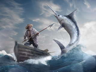 Pra quem chegou agora no planeta Terra, a coisa gira em torno do véio Santiago, um cubano pescador que, já completamente desprovido da vitalidade de outrora, tenta sem sucesso tirar seu sustento do mar. Pra quem estranha a nacionalidade do sujeito e a ambientação do romance, fique sabendo que o autor morou um tempo em Cuba, onde ele inventou, segundo a lenda, o mojito. O velho tem como único amigo um garoto, que lhe ajuda nas pescarias e que lhe dá de comer quando tudo mais rareia na geladeira – uma amizade que seria muito útil pra mim, tendo em consideração o constante e deplorável estado da minha geladeira (por enquanto esse amigo continua sedo o motoboy do delivery). Os pais do moleque, mesmo assim, não gostam que ele vá pescar com o Santiago porque ele é azarado, e se tem uma espécie supersticiosa nesse mundo é pescador. Aliás, qualquer pessoa que frequenta muito o mar, de surfista a pirata. É uma coisa natural. Uma hora a parada vira, você fica num mato sem cachorro e pra te acharem naquele mundaréu de água salgada só com muita reza braba e foguetório sinalizador. De modo que o velho sai pra pescar sozinho, na esperança de fazer uma economia aí pros dias que se apertam, uns peixinhos que dê pra vender sem precisar vender muito o peixe, e não é que aparece um PEIXE-ESPADA MONSTRUOSO ASSASSINO VINGATIVO AMIGO DO PCC. E o velho tá lá, mãozinha na fieira, puxando o bicho na maior história de pescador que poderia ter imaginado. O bicho é irascível, e cansa o velho, que passa dias e noites com a linha na mão ponderando sobre a sua fraqueza, sobre a sua habilidade de pescador e sobre a beleza e magnitude do peixe que agora precisa pescar para recuperar sua honra de pescador não-azarado. Isso é 90% do livro. Uma narrativa sintética com monólogos do velho Santiago sobre essas questões aí. A coisa segue nessa toada até que ele consegue finalmente pegar o bicho, e dá um jeito de amarrar ele no bombordo do barquinho, numa proeza que nenhum Pesque e Cia. até hoje mostrou.